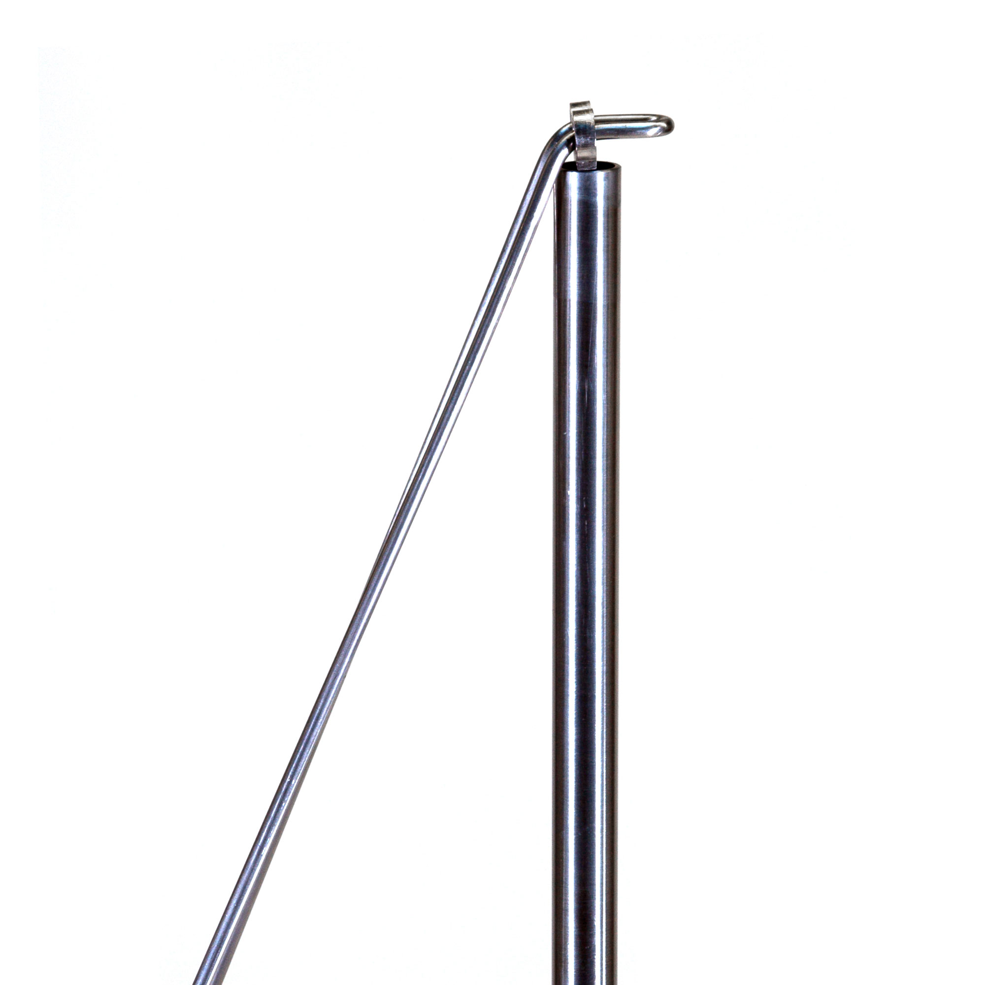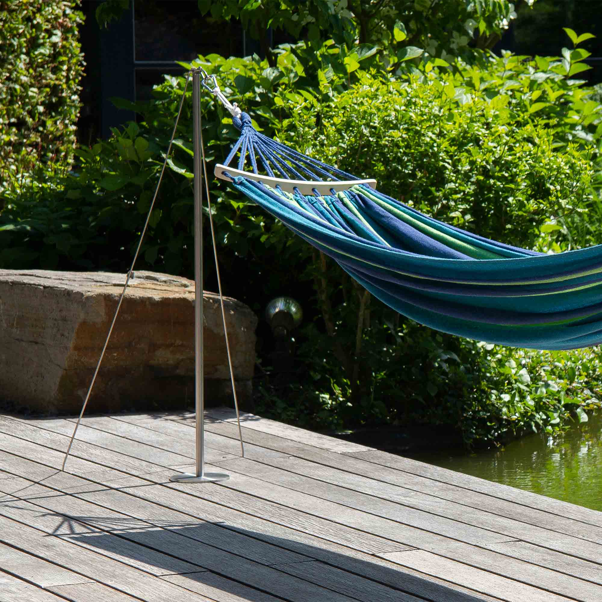 The hammock bracket consists of only two parts: the fork and the push rod. They are set up without tools in no time and dismantled just as quickly ➜. All parts are made of stainless steel and therefore can stay outside permanently. If you have a fixed railing or a wall hook, only one suspension is sufficient.